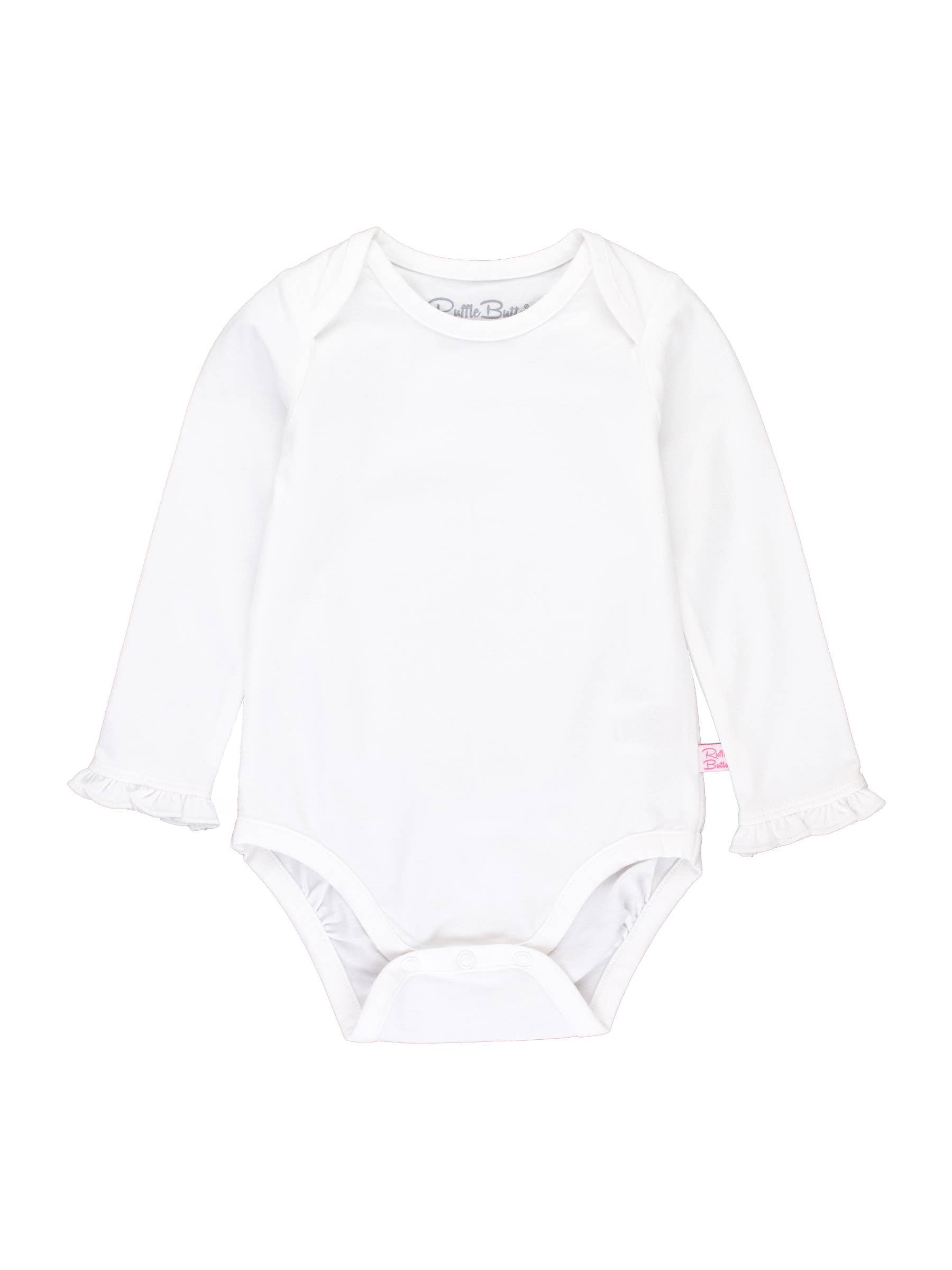 This darling bodysuit is crafted from soft, stretchy knit fabric and combines comfort and style effortlessly. With its charming ruffle detailing, long sleeves, and convenient snap closure, it offers both versatility and convenience, making it perfect for everyday wear or dressing up for special occasions. Great for layering! Available in a matching shirt for older girls as well.