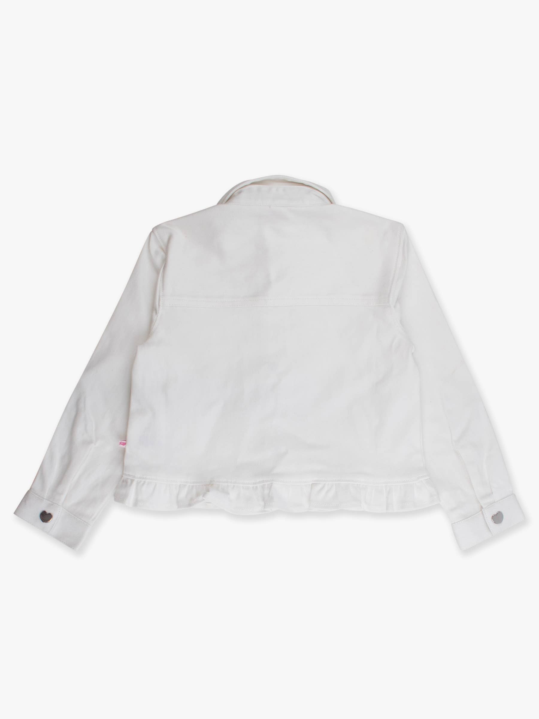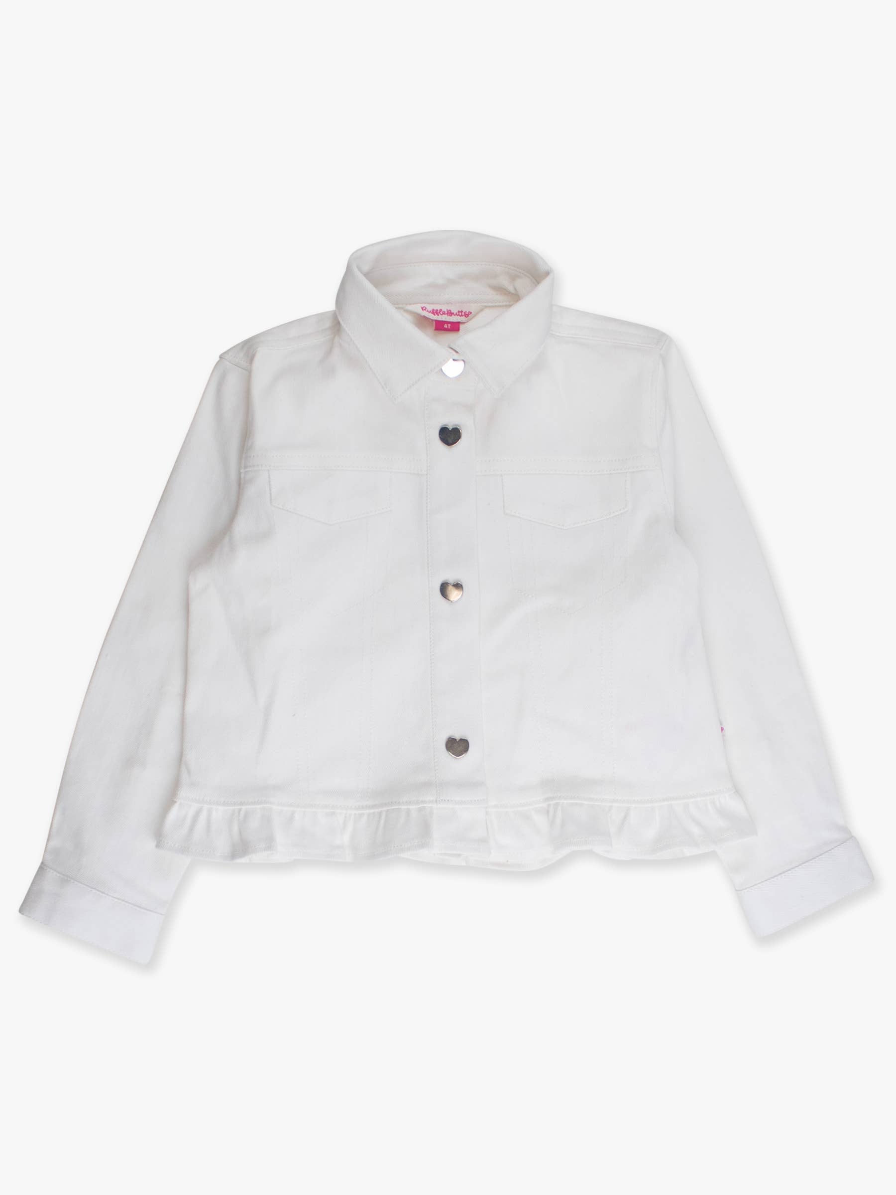 Girls White Stretch Denim Ruffle Jean Jacket with Heart Buttons : White / 2T