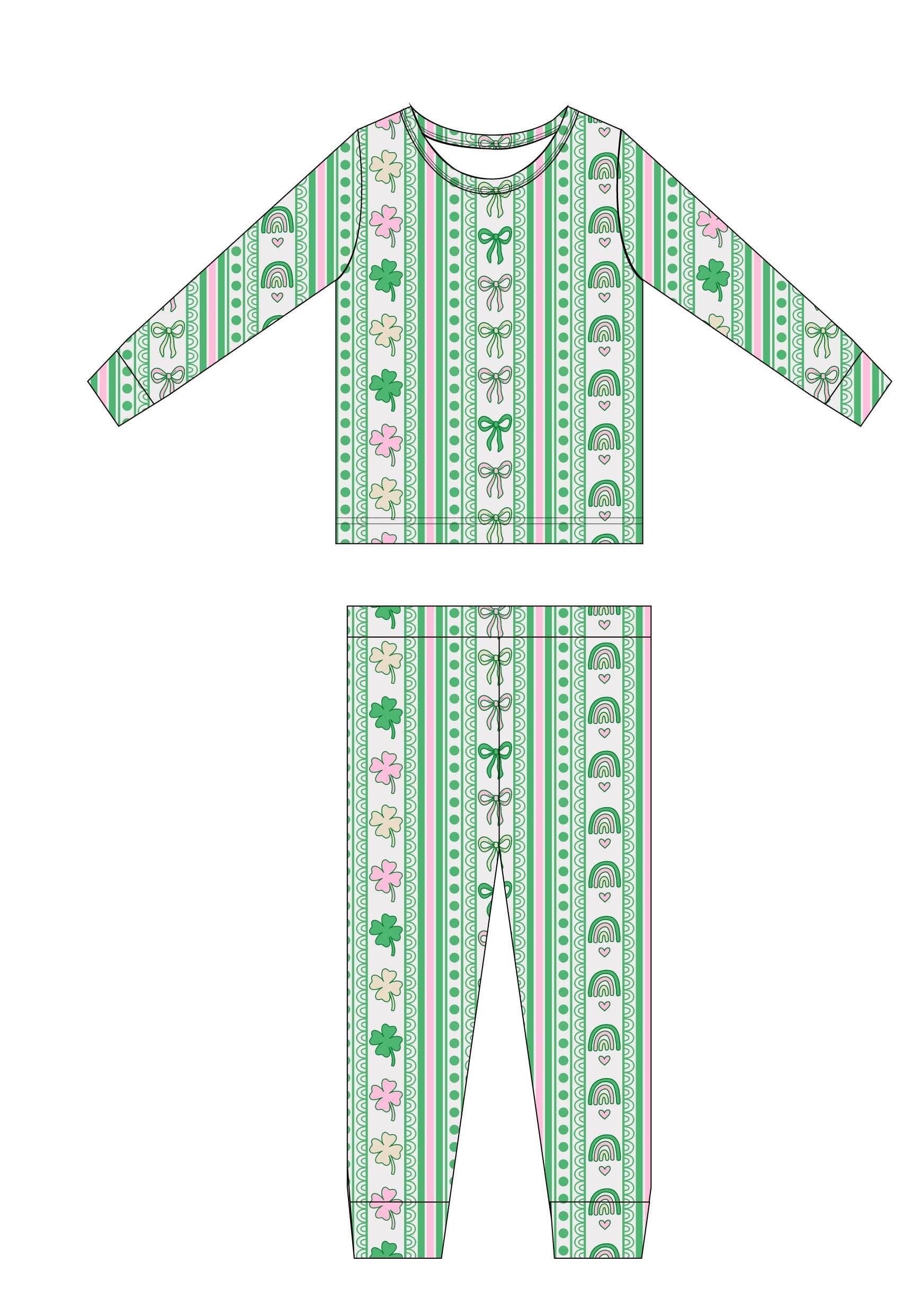 Bright, sweet, and full of festive charm, the Lucky Rainbow Ribbons Dream Set features matching top-and-bottom pieces decorated with rows of rainbows, shamrocks, bows, and hearts in cheerful greens and soft pinks. Soft, stretchy, and perfect for play, sleep, and celebrating St. Patrick’s Day in adorable style, this set brings a fun and girly twist to lucky-season matching. 💚✨