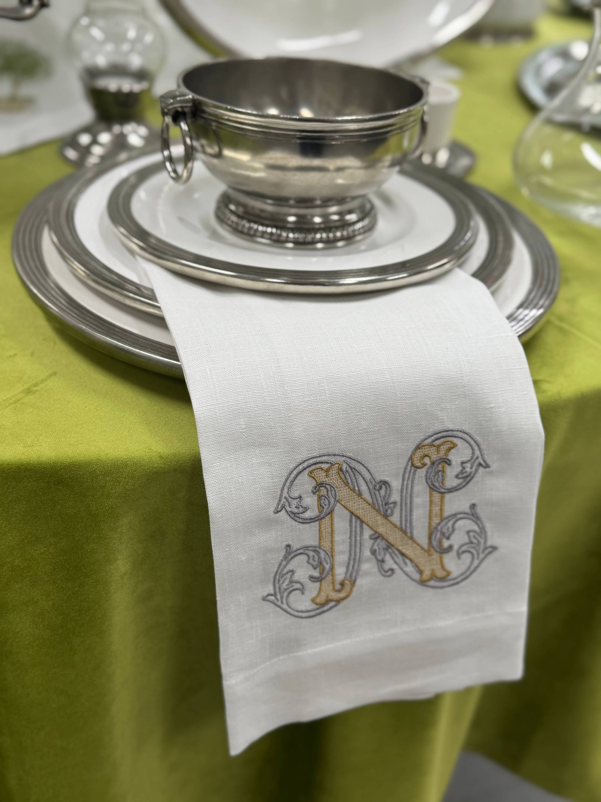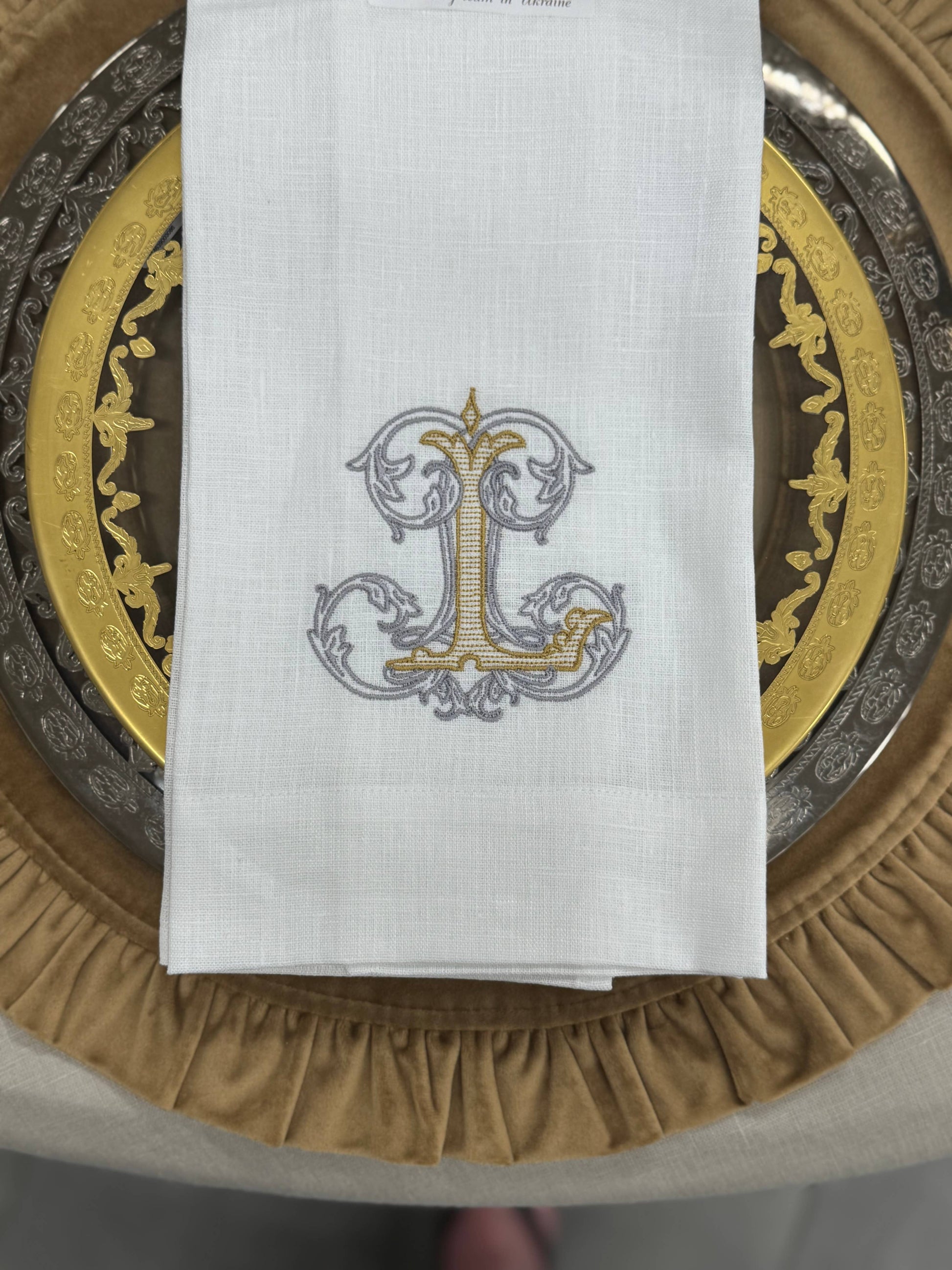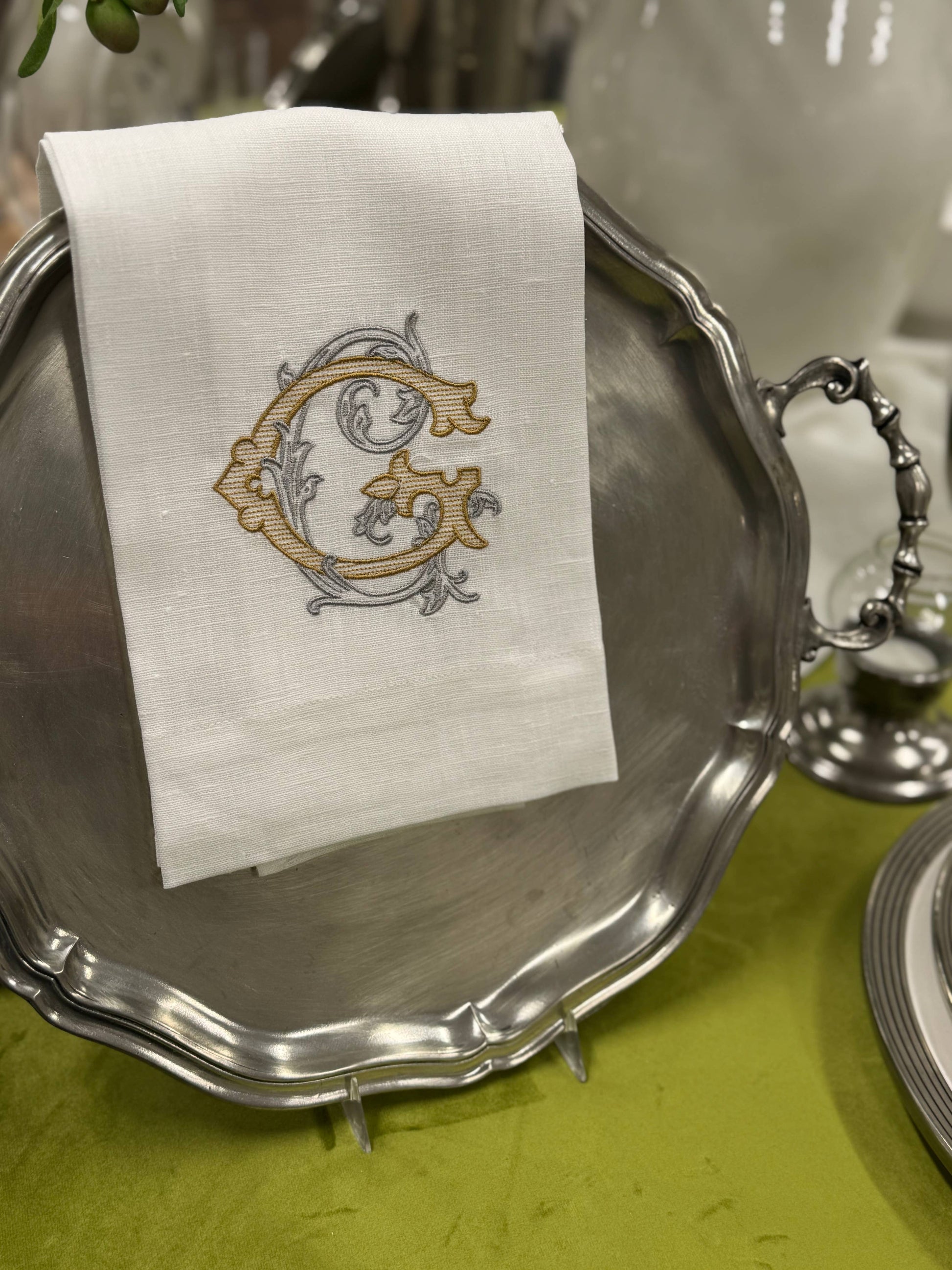 Our 100% European linen tea towel is a perfect mix of elegance and beauty. Each towel is embroidered with a detailed Vintage Vine monogram embroidery in the center with 21 different letters available. Machine wash and lay flat to dry for a soft and comfortable look. Iron if desired for a more formal look.